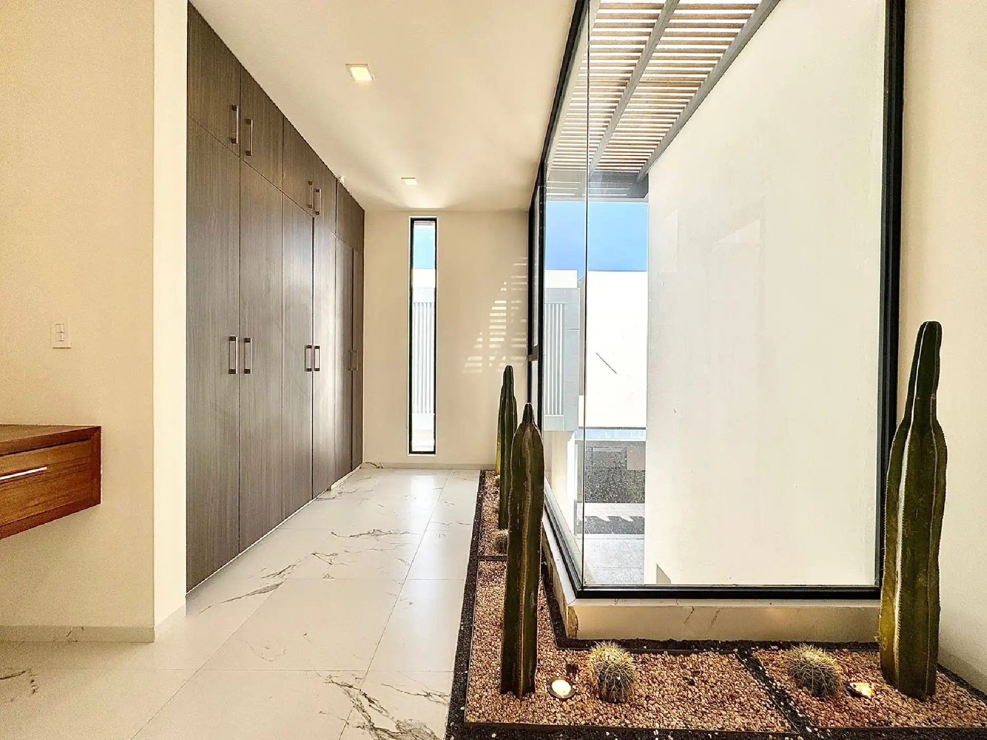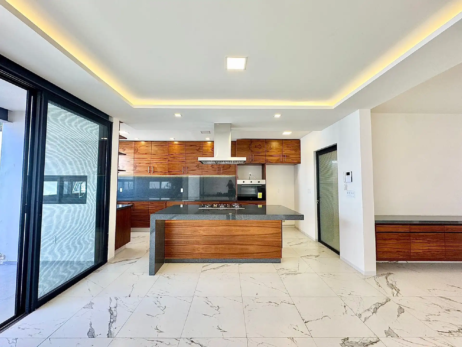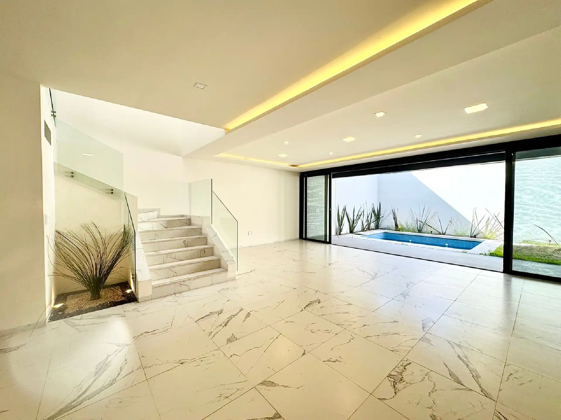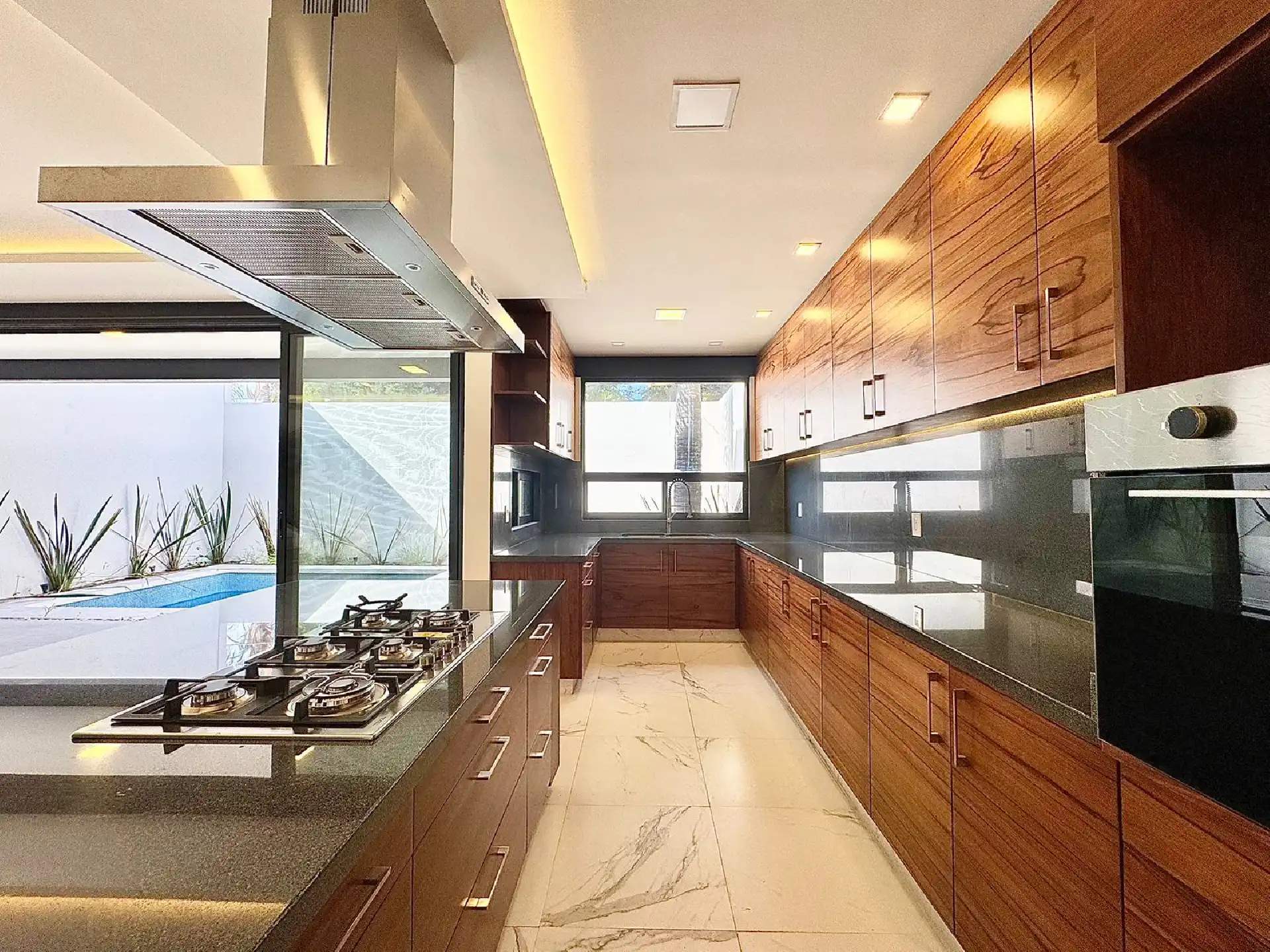 Planta baja: • Casa con iluminación inteligente. • Garage eléctrico tipo americano para 2 autos. • Sala comedor con ventanal corredizo y credenza con barra de mármol belaggio. • Amplia cocina totalmente equipada con isla y cubierta de granito y acabado de tzalam. • Cuarto de lavado y alacena. • Cuarta recámara con clóset y baño completo. • Medio baño de visitas. • Jardín con piscina y terraza.