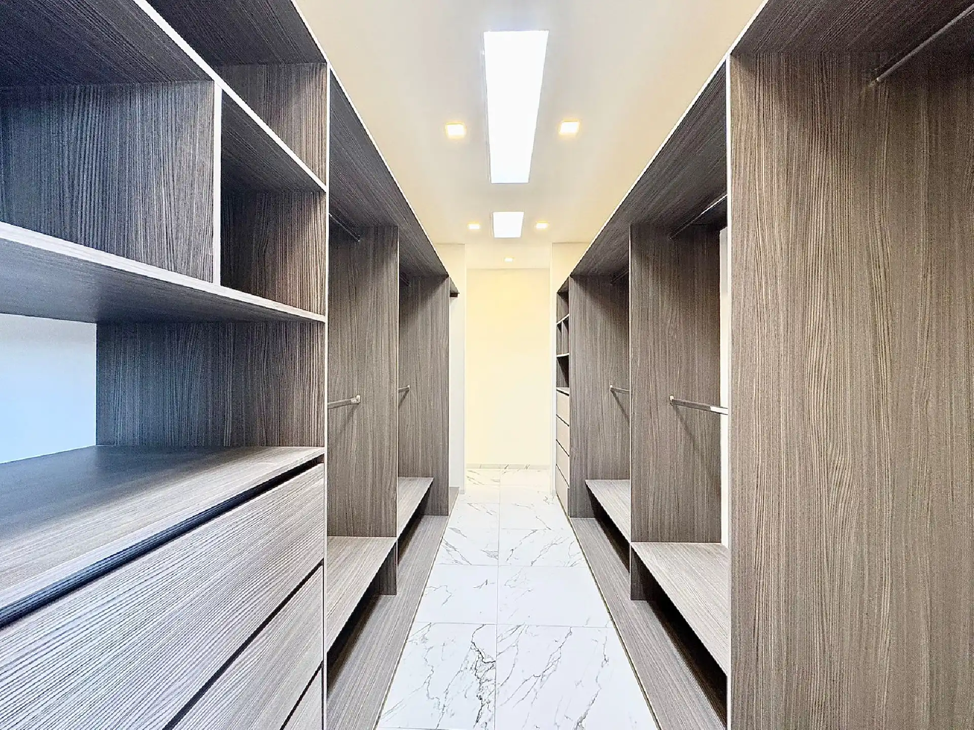 Planta alta: • Espectacular recámara principal con terraza, vestidor con acceso doble y baño completo. • Dos recámaras con vestidor y baño completo. Divididas por jardín interior. • Family Room / estancia con mueble de T.V. de tzalam y terraza. • Jardineras interiores. • Clóset de blancos.